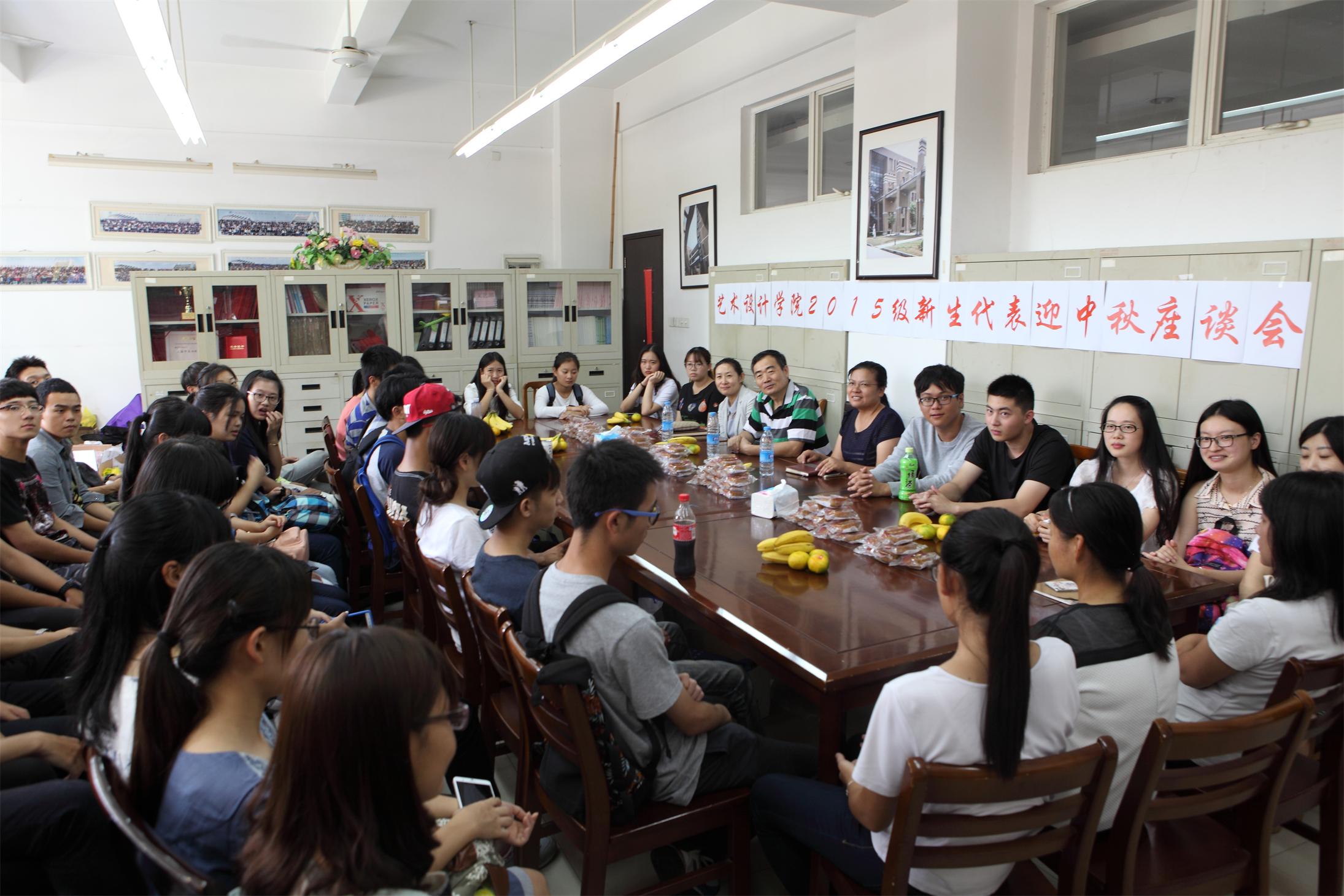 在2015年本科及研究生新生代表座谈会上,与会同学畅所欲言,共话中秋佳节,外省、上海市的研究生及本科新生津津有味地讲述了与家人吃月饼、赏月共度中秋佳节的童年趣事。党总支书记许传宏也饶有兴趣地与大家分享了自己小时候家里自制月饼的小故事。他讲到,中秋佳节是中华民族的传统节日,是滋养中华民族的精神血脉,也是留给后人的宝贵文化遗产。无论省市、地域,今日艺术设计学院一家人团聚一堂,共迎中秋,共叙佳节,共享团圆之情,也祝愿大家学习愉快,健康成长成才,预祝大家中秋愉快。