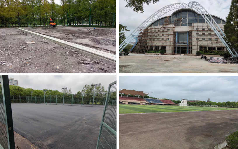 体育场馆修缮工程于8月10日正式动工,维修总面积约为24639.5 ㎡ (其中修缮建筑面积8877.5 ㎡ ,室外运动场地面积约15762 ㎡ ),维修改造后,将极大得改善室内场地长期漏水,运动设施陈旧损坏、户外篮球场及其他场地积水等问题。