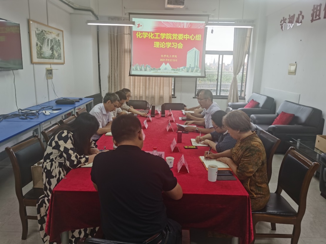 为深入领会习近平总书记给全国高校黄大年式教师团队代表重要回信精神,贯彻落实教育部《关于学习贯彻习近平总书记给全国高校黄大年式教师团队代表重要回信精神的通知》精神,进一步推进学院师德师风和教育教学建设,化学化工学院党委中心组于9月15日下午召开了专题学习会。会议由学院党委书记宋勤健主持,学院全体党政班子成员、工会主席、党政办主任、团委书记等参加会议,校党史学习教育巡回指导组成员吉祥老师列席会议。