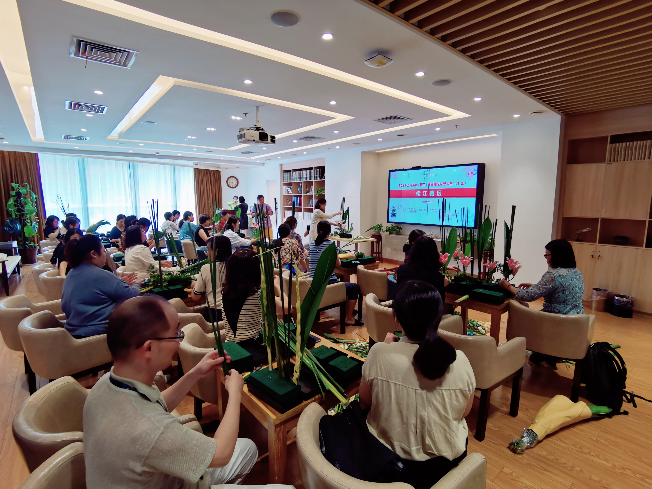 活动分为培训和比赛两个环节。花艺师首先对花材品种、特点等作了讲解,以娴熟的手法对插花的技巧进行了示范。在实践插花环节中,老师们纷纷与花艺师交流互动,互相切磋,现场花香四溢,气氛轻松、愉悦而温馨。比赛环节,老师们聚精会神,通过修剪、搭配、构思,以空间艺术展现审美格调,赋予一花一叶新的生机活力,呈现出一个个色彩斑斓、制作精美的花艺作品。