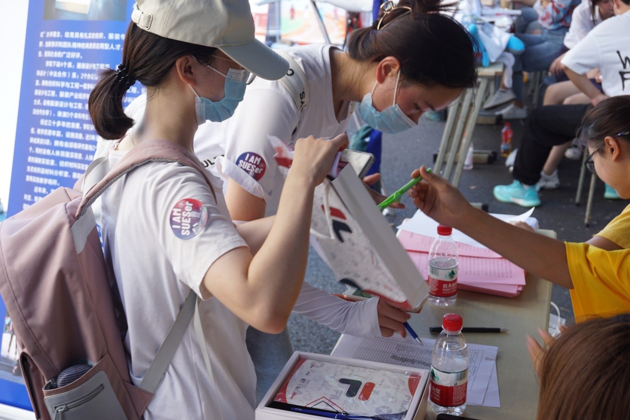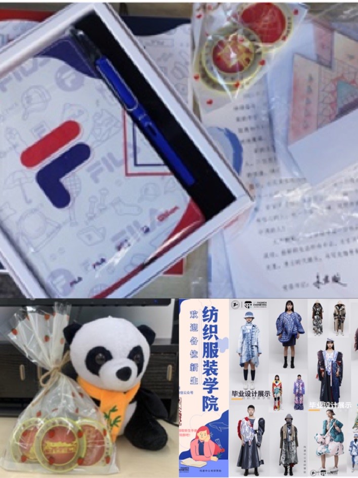 今年纺织服装学院的迎新以“披青春霓裳,书崭新篇章”为主题,分为“回首·感恩、未来·梦想、强国·有我”三个板块。在“回首·感恩”板块中,学院送给每位新生由学院党政领导亲笔签名的新生寄语和校友企业斐乐服饰有限公司赞助的笔记本套装作为开学的第一份礼物,倡导每一位新生感恩社会、感恩学校、感恩家人。“未来·梦想”板块中,学院给每位新生准备了以工程大标志性建筑物图书馆为模板设计的大学生涯规划主题明信片,引导新生在入学之初对大学生活做出生涯规划。“强国·有我”模块中通过问答党史知识与学生互动,并为新生赠送由学院学生设计的以全国34个省市自治区红色经典或党性教育基地为背景的徽章,希望以徽章形式引导新生弘扬红色精神,继承红色基因。