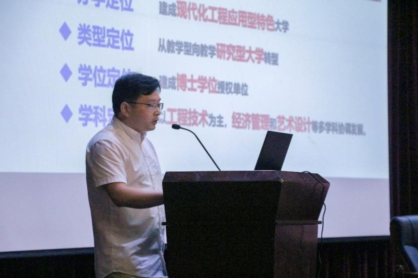 何涛副院长作学院介绍。他指出学院拥有优越的科研平台、优质的教师队伍、一流的学术资源和浓郁的学术氛围,希望各位青年学子要心怀大志、眺望远方,做一个有理想、有抱负的人;要学会正确的选择,立志成为一个脚踏实地、勤勤恳恳的人;要学会宽容与体谅,成为一名心胸开阔的人;同时祝愿新生同学们在工程大的四年里,心有所向,心存宏志,收获梦想,成就未来!
