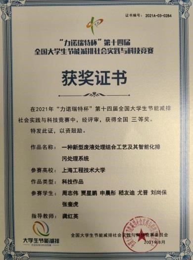 8月31号,“力诺瑞特杯”第十四届全国大学生节能减排社会实践与科技竞赛在山东大学完美落幕。我院龚红英教授指导的周志伟学生组作品“一种新型废液处理组合工艺及其智能化排污处理系统”荣获全国三等奖,这是今年该学生科研组在该项赛事取得一项佳绩。