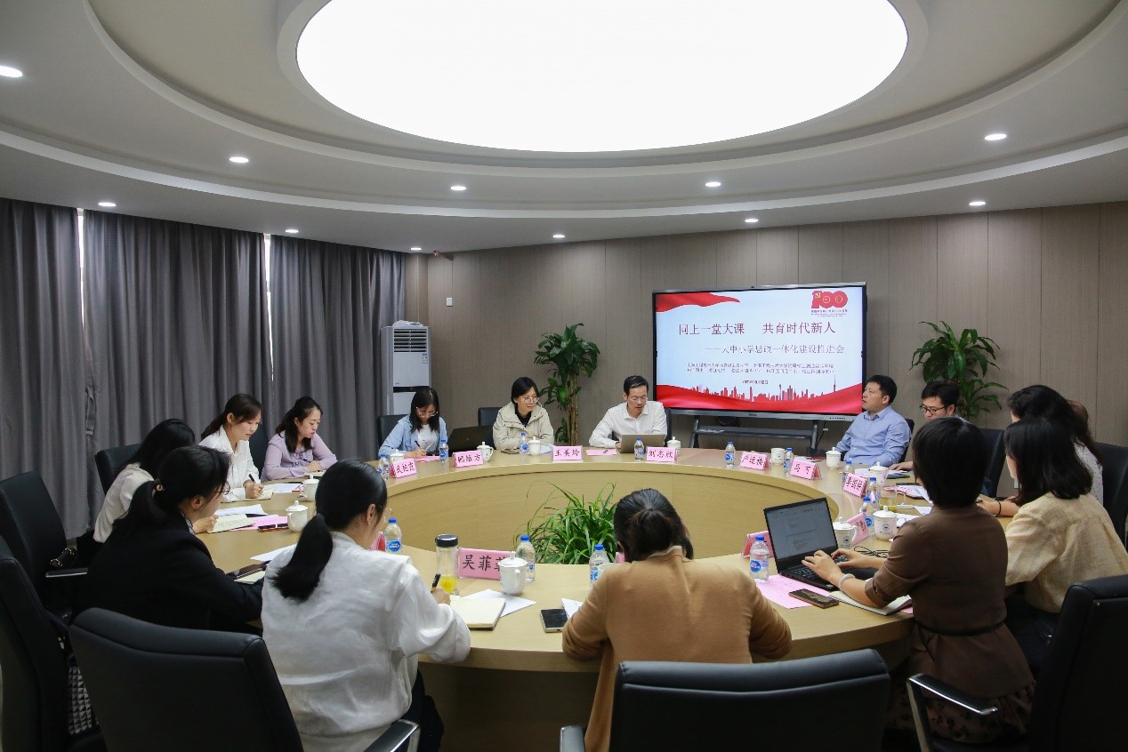 俞书记介绍了泗泾附校的前期工作推进情况及后续工作计划。自今年5月“大中小学思政教育一体化建设”三校签约仪式以来,主要开展了三个方面的活动:工程大马克思主义学院相继有党总支书记许传宏、副院长于凯在“腾飞讲坛”做主题报告,迄今为止,讲坛共开讲8次;受工程大“交通中国”系列课程启发,依托工程大校内资源开展了“交通强国 礼赞百年”系列行走思政课;依托松江红色旅游景点、寻根文化及交通变化开展暑期研学系列活动。针对后续工作计划,她提出,未来可通过搭建一体化教研平台、建立一体化的培育机制来构建大中小思政课教师的联动机制,通过打磨课程思政“金课”、打造“交通中国”精品课程来推动全面思政的课程改革,通过落实协同育人机制、丰富思政教育载体来整合铸魂育人的教育资源。