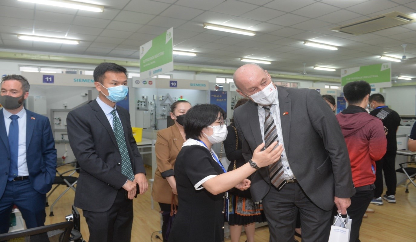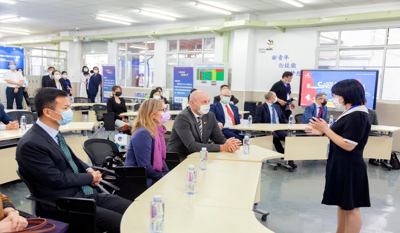 10月12日下午,在第46届世界技能大赛倒计时一周年之际,大赛组委会在上海中心举办外交官“走进世赛”主题活动,交流推介会后,来自7个国家驻沪领事机构12位总领事及高级领事官员来到上海市高级技工学校观摩工业控制、增材制造世赛项目,校党委书记倪智勇、校长沈勤等接待了来宾。