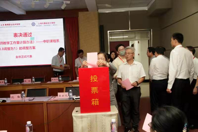 人事科科长林春就各代表组汇总的意见和建议,向全体代表作了补充说明。全体代表对以无记名投票的方式表决,全票赞成通过了《〈教师教学工作量计算办法〉——中职课程系数由0.8调整为1》的调整方案。