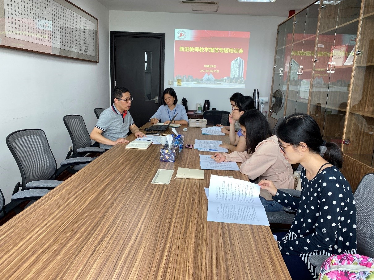 党史学习教育以来,外国语学院新进教师反映在本科生和研究生公共英语课程教学过程中,对课程过程资料的把握和运用有时还拿不准,给教学带来一些困扰。外国语学院经过访谈发现,主要原因是教师对教学规范还不太熟悉,政策还没有把握准确。学院领导高度重视这一问题,10月15日中午,外国语学院在行政楼1506举行了新进教师教学规范专题培训会。通过举行教学培训、教学质量检查等形式,帮助新进教师及时了解各类教学制度,规范教学秩序,确保教学各条线顺畅运行。4位新进教师参加了培训会,会议由副院长刘金龙老师主持。