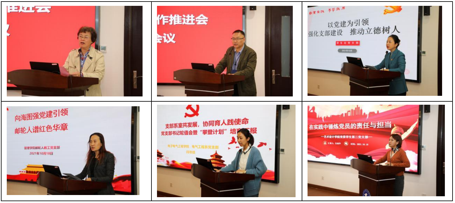 管理学院党委“邮轮人”教工党支部书记闫国东、电子电气工程学院电气工程系党支部书记闫书佳、机关党委学生处党支部书记朱蓓、艺术设计学院党委学生第二党支部书记朱瑞华分别从支部发挥科学研究、组织育人、管理服务、社会服务等功能角度,围绕学科建设、人才培养、三型机关建设、区域化党建和我为群众办实事等作了交流分享。管理学院党委书记周洁、航空运输学院党委书记徐建华在会上作了点评交流。