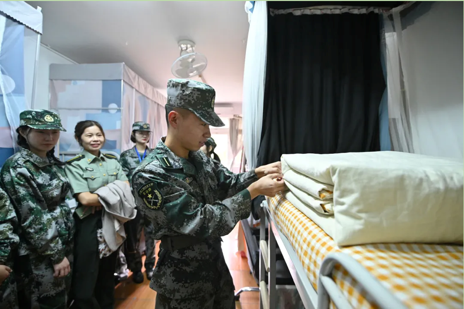 10月16日上午,军训场地受到了天气的限制,原定计划的军事训练改为了宿舍内务整理。刘江副书记、辅导员老师、全体教官前往学生宿舍检查内务,并进行了相关的内务整理教学。一床被子,经过反复的折叠、按压、摩擦,从刚开始的松软不成型,到后来逐渐呈现为完美的“豆腐块”。在教官的悉心指导,同学们经过“三分叠,七分修”,被子变得有棱有角,床铺焕然一新。