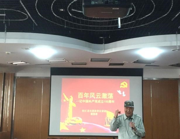 活动中,学院结合党史学习教育特邀上海新四军历史研究会讲师团团长谢鲁淮同志做了《百年风云激荡》主题宣讲。谢鲁淮同志讲课深动精彩,风趣幽默。他以抗美援朝战争为主线,结合大量史实,讲述了当年风云战争中的感人故事,同时也围绕当季热映的电影《长津湖》,讲述战役中革命先烈视死如归、保家为国的革命精神。报告让所有现场老同志和老师们深受鼓舞,坚定信仰。