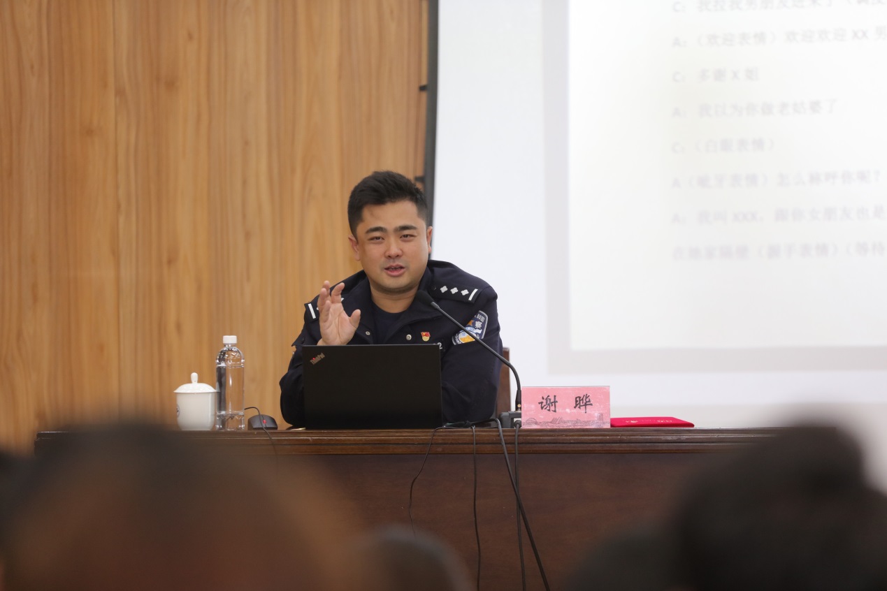上海市公安局文保分局治安大队谢晔警官为全体学员讲授《大学生反诈必修课》,他用诙谐的语言、丰富的案例,生动讲解了高校高发诈骗手法,以及针对不同诈骗手法的防范要点,提醒同学们学会辨别与抵制金融骗局,提高反诈骗意识。