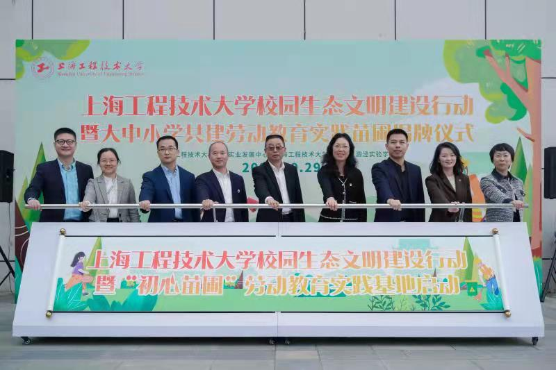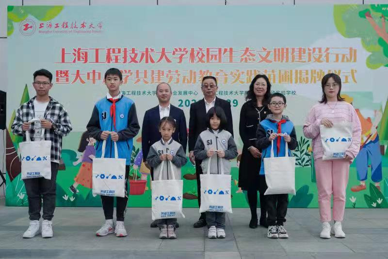 10月29日中午,校园生态文明建设行动暨大中小学共建劳动教育实践苗圃揭牌仪式在松江校区第一食堂广场举行。副校长姚秀平,松江区教育局基教科杨立东,工程大泗泾附校党支部书记俞红蕾、校长季国栋、副校长赵梦影、副校长李燕,我校教务处处长陈浩、后勤中心党总支书记熊筱晶、主任王佳杰及师生员工代表出席活动。活动由后勤中心副主任高丹主持。