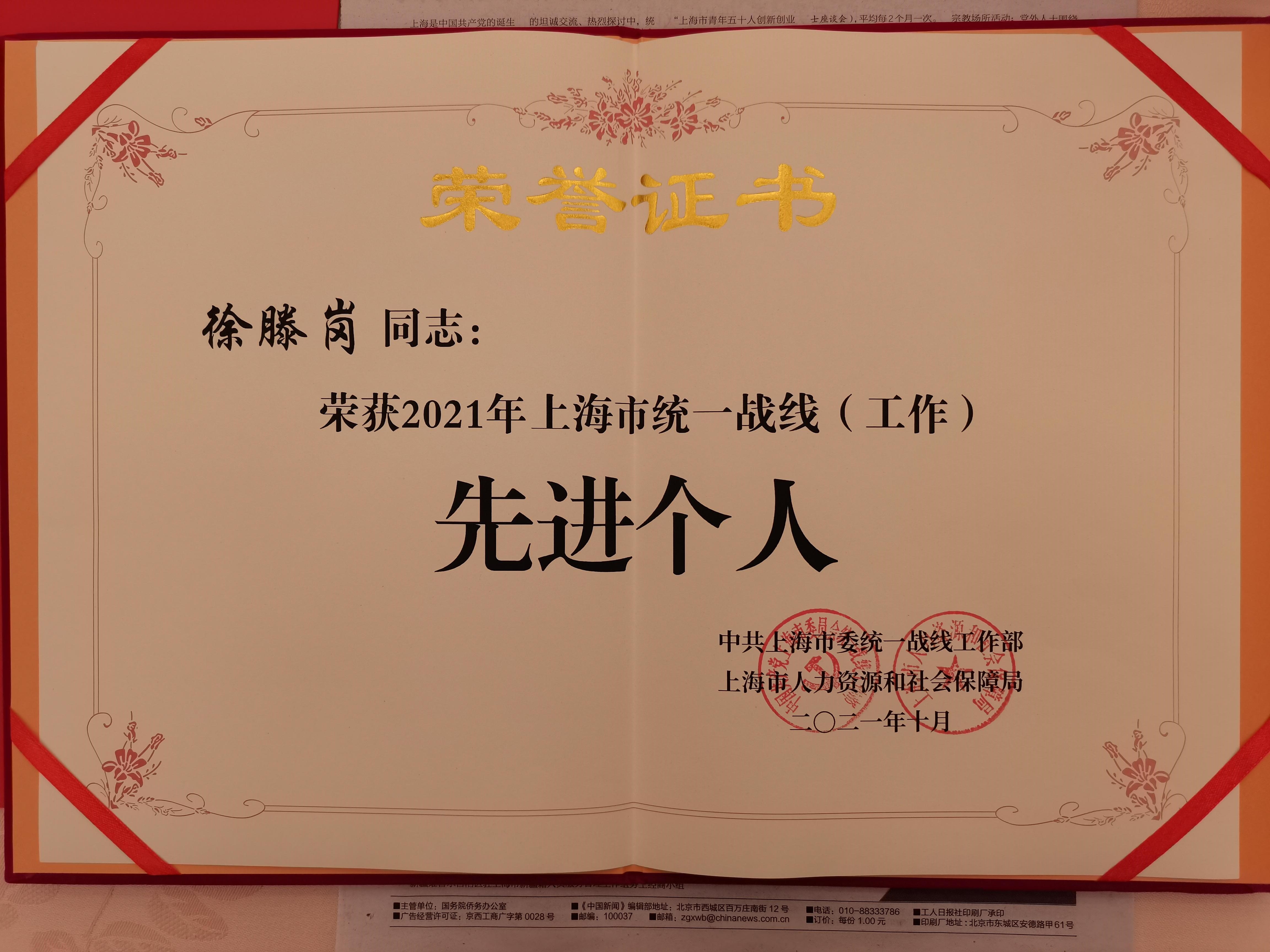 11月8日,2021年上海市统一战线(工作)先进集体和先进个人表彰大会暨经验交流会在上海展览中心举行,本市40个先进集体和100名先进个人获得表彰。我校世界技能大赛中国(上海)研究中心主任、原九三学社委员会主委徐滕岗获上海市统一战线(工作)先进个人光荣称号。
