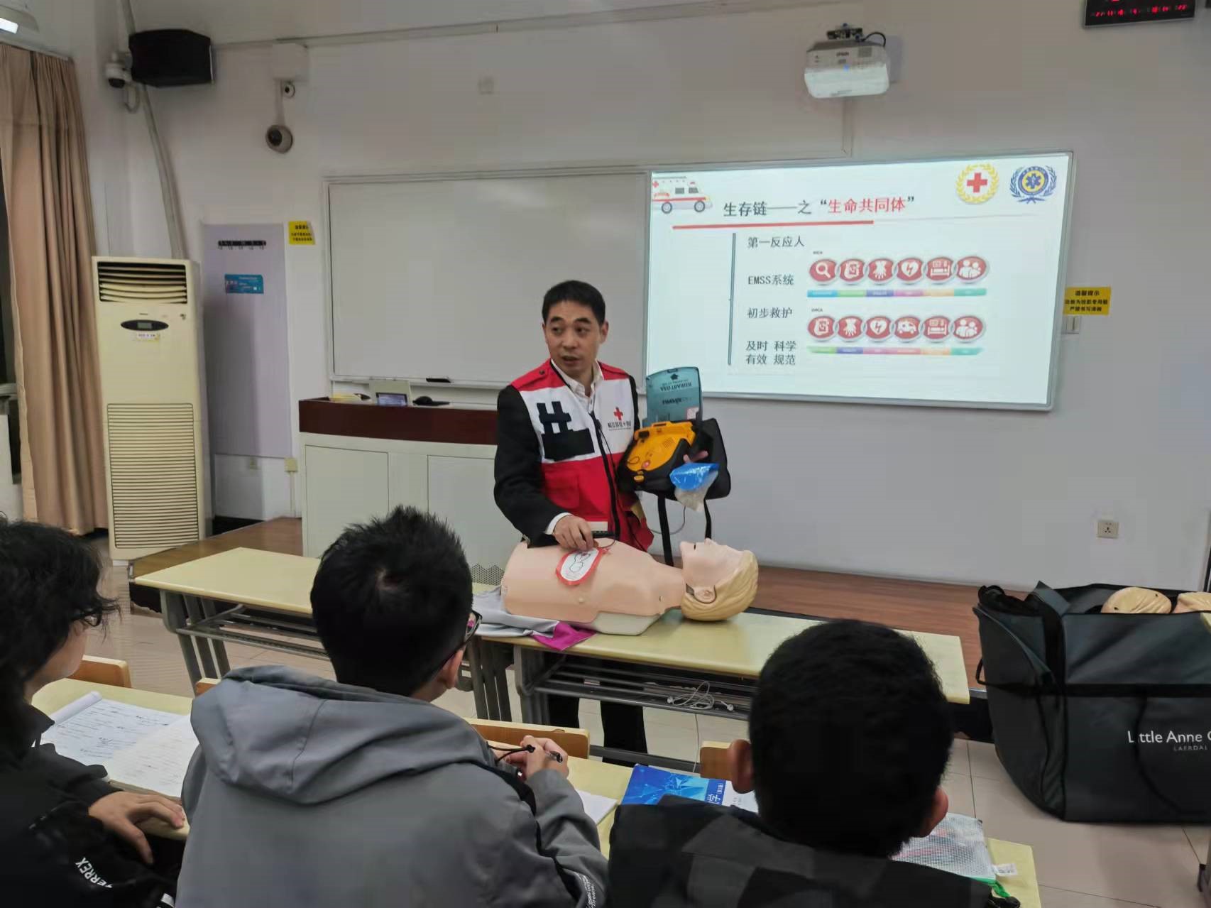 培训的主要内容为急救理论与实践。通过应急救护培训,帮助同学们初步掌握成人心肺复苏、成人气道异物梗塞、自动体外除颤仪(AED)的操作方法,以及部分简易的创伤救护包扎技巧,进一步普及生命健康教育,提高同学们应对突发事件紧急处理的能力。