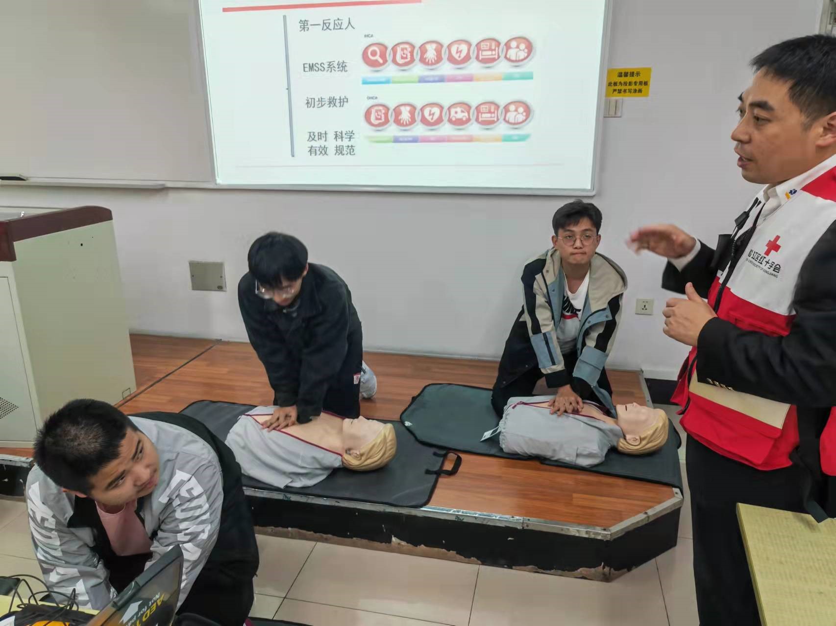 培训的开展,不仅让同学们明白紧急救护就是与时间赛跑,在最短的时间做出最正确且及时的救护处理办法至关重要,更深刻感悟“人道、博爱、奉献”的红十字精神与“奉献、友爱、互助、进步”的志愿者精神,切实提高青年在面对意外事故和危重病发生时的应急能力,为大家的人身安全又构筑了一道安全防火墙。