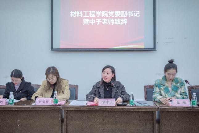 院党委副书记黄中子代表材料工程学院党委对大会召开表示祝贺,对院研究生会在管理服务、科研创新、丰富文体活动等方面取得的成绩表示肯定,她号召全体研究生在新时代争做投身祖国建设的引领者、践行创新创业的实干者、推动社会发展的奉献者。黄老师强调,研究生组织要找准定位,做到讲引领、讲担当、讲协作、讲发展,成为学生心目中“靠得住”的研究生会。