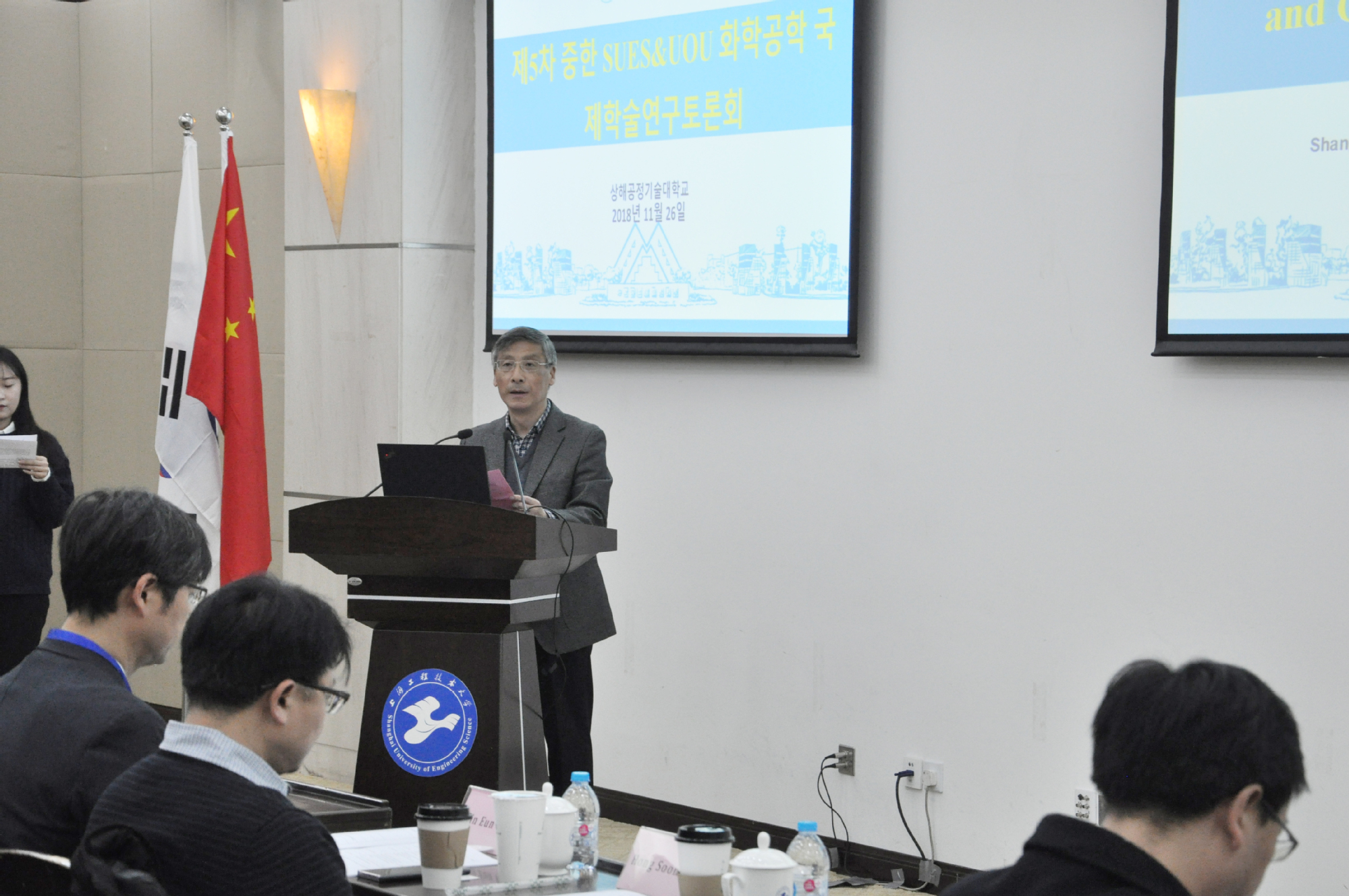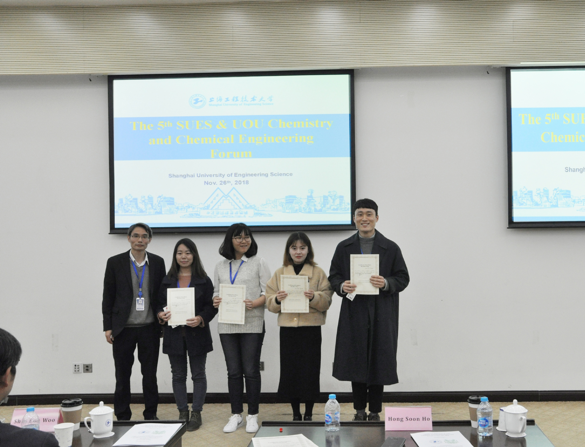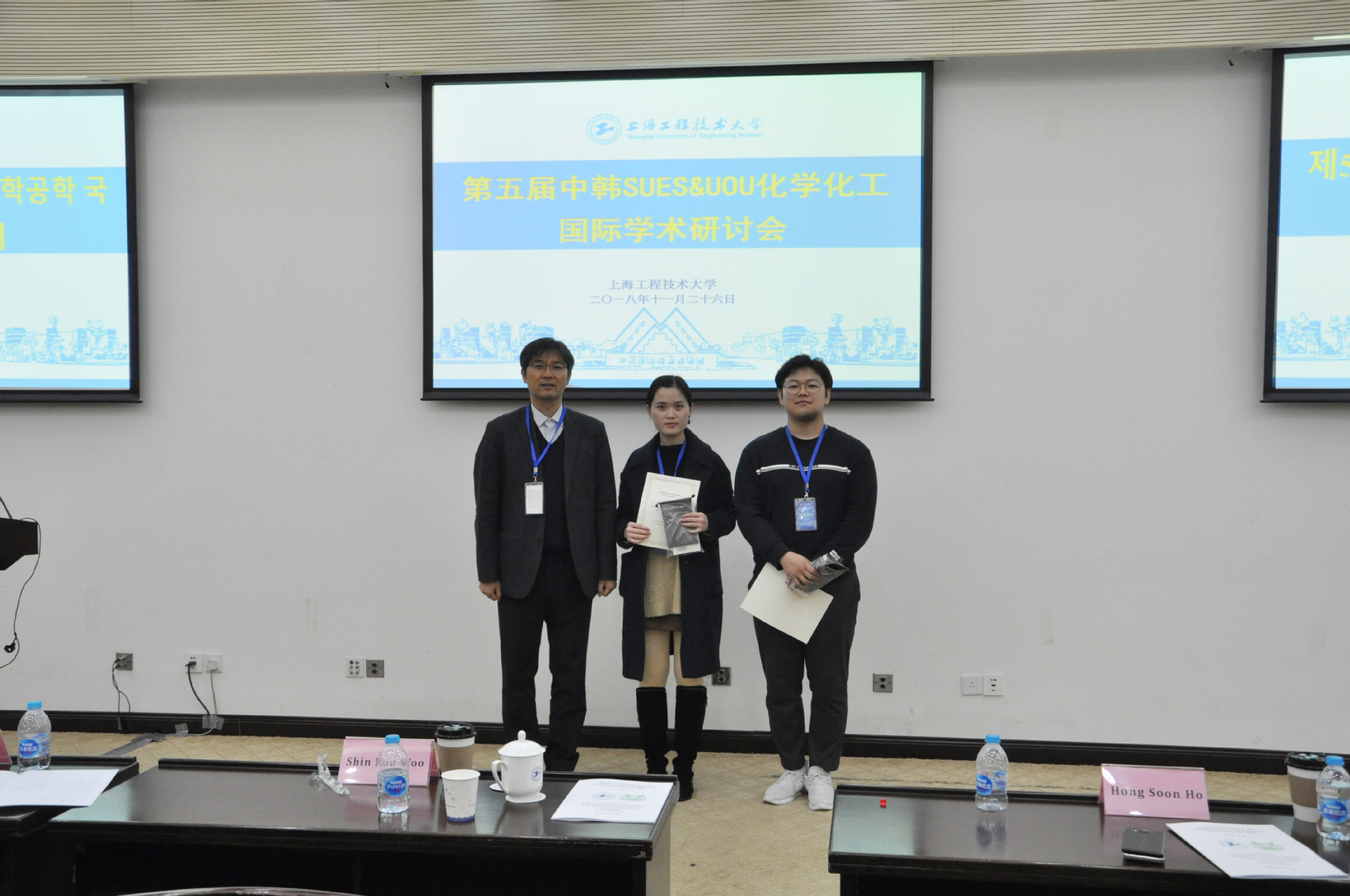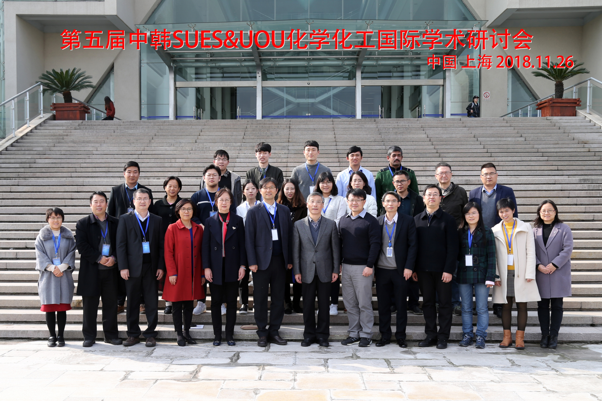 由上海工程技术大学化学化工学院与韩国蔚山大学化学与生物化学工程学院联合举办的“第五届中韩SUES&UOU化学化工国际学术研讨会”于11月26日下午在我校图文信息中心第三报告厅召开。参与本次论坛的韩国蔚山大学代表团由Shin Eun Woo、Hong Soon Ho 两位教授及8名学生组成。上海工程技术大学党委副书记鲁嘉华教授出席会议开幕式并致欢迎辞,国际交流处钱慧敏处长、化学化工学院党委书记刘宇虹、党委副书记、院长饶品华、党委副书记熊筱晶、副院长王锦成、任新锋及学院教师代表、研究生代表、本科生代表等近60人参加了本次论坛。