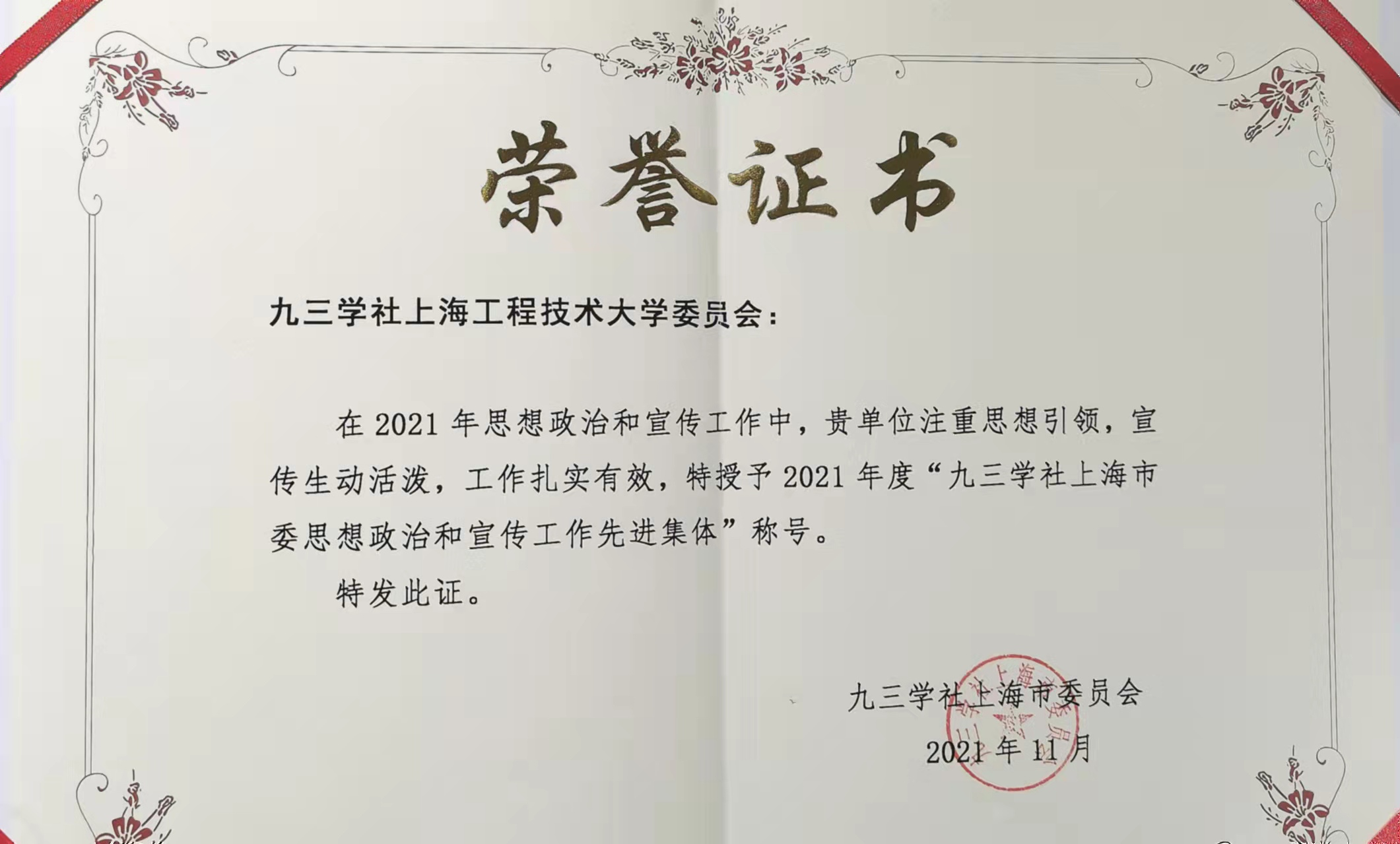 在11月29日召开的九三学社上海市委思想政治和宣传工作总结暨表彰会议中,我校九三学社委员会荣获九三学社上海市委员会颁发的2021年度“九三学社上海市委思想政治和宣传工作先进集体”表彰。