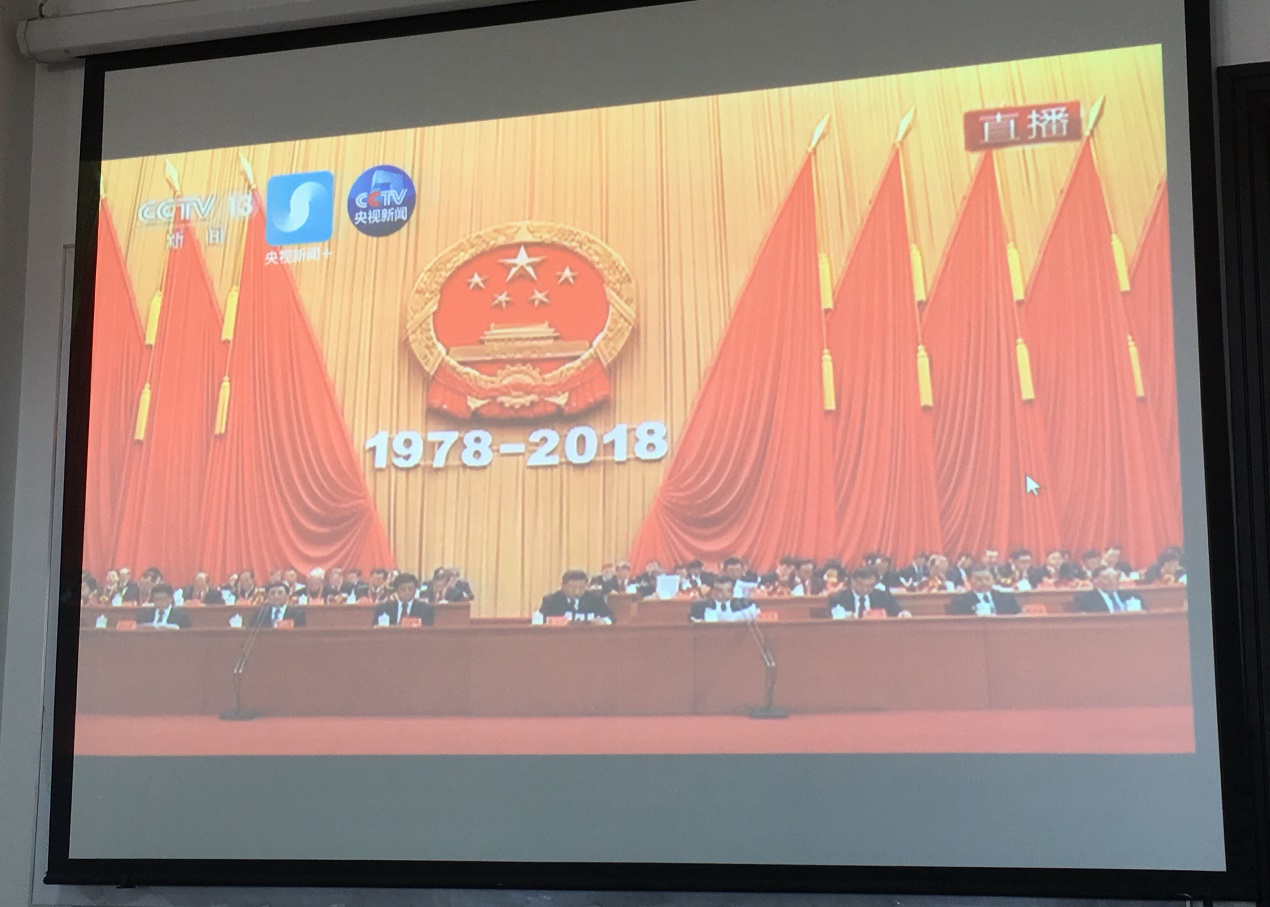 12月18日上午10时,数理与统计学院组织全院老师和全体研究生同学于行政楼1308集体观看了《庆祝改革开放40周年大会》的同步直播。