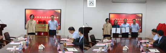 方宇与沙莎为校企产学研合作基地揭牌。张海峰与高晓瑜代表双方签署产学研合作协议书。