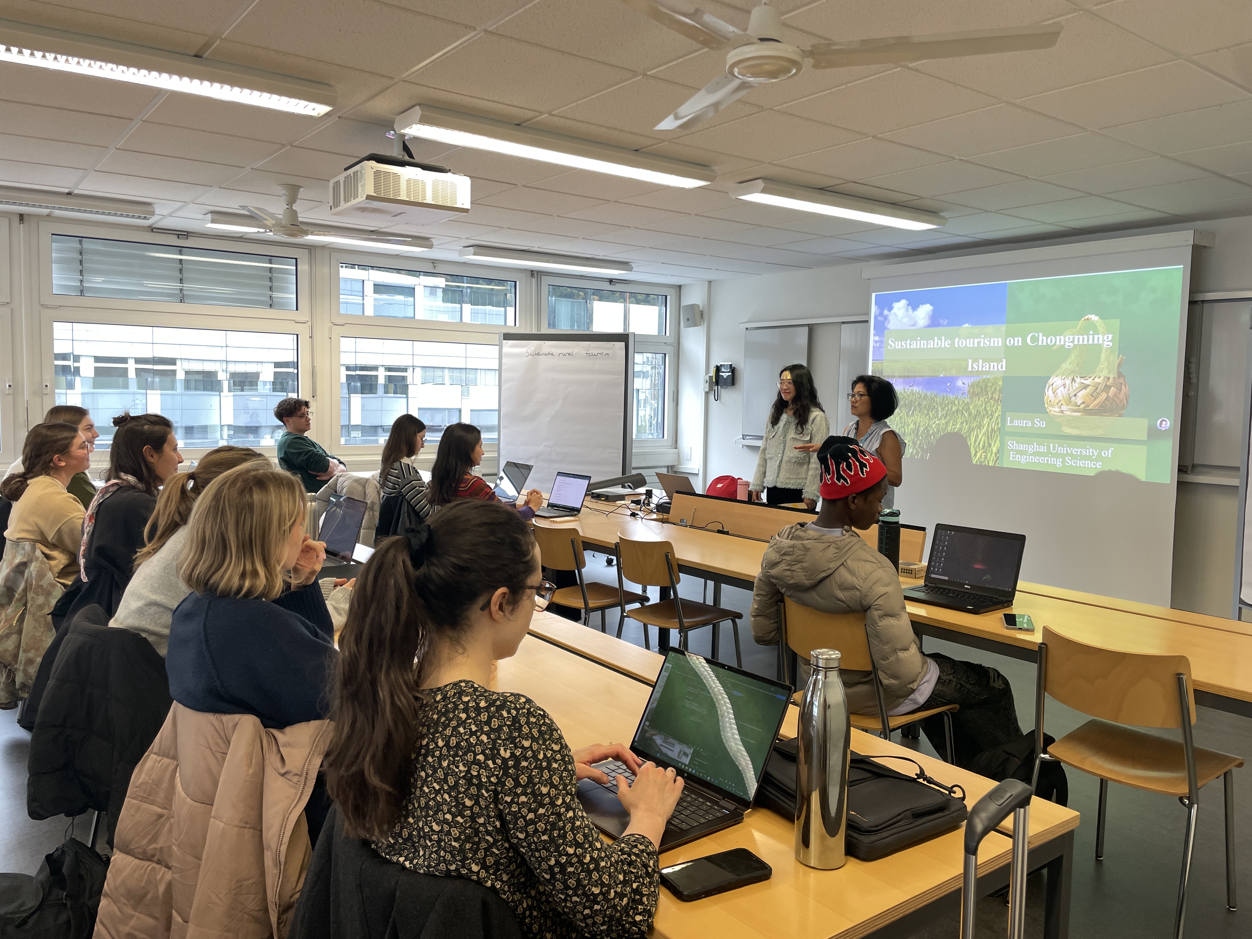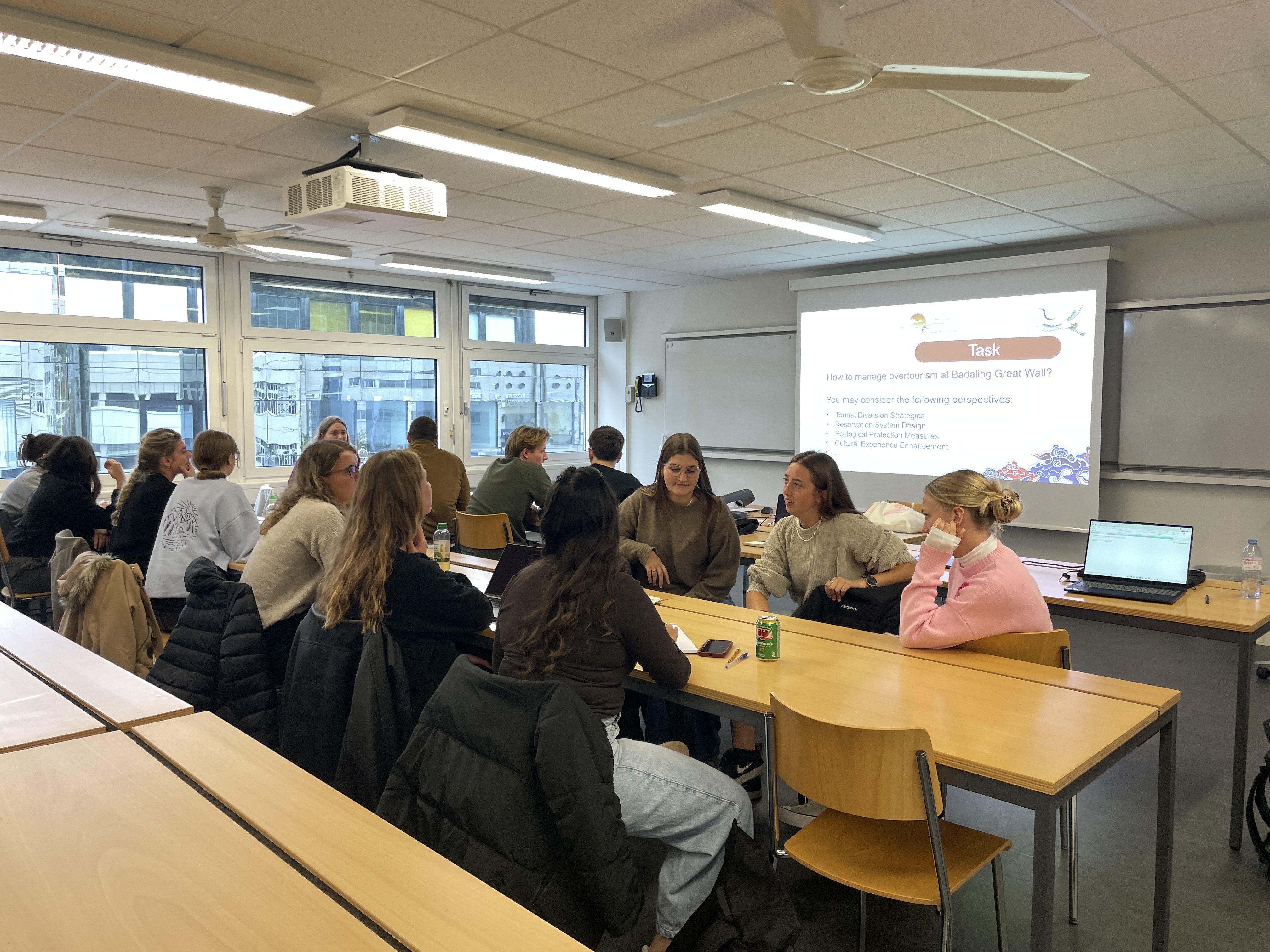 在瑞士期间,4位教师围绕“跨境旅游——来自中国的见解”这一核心主题,为约60名FHGR学生呈现了四场精彩纷呈的讲座。讲座聚焦中国旅游市场的多元面貌,设计了四个主题:文化遗产与历史旅游(长城、丝绸之路)、现代都市旅游(上海、北京)、可持续与乡村旅游(生态村庄实践与乡村振兴战略)、旅游趋势与中国出境游客。