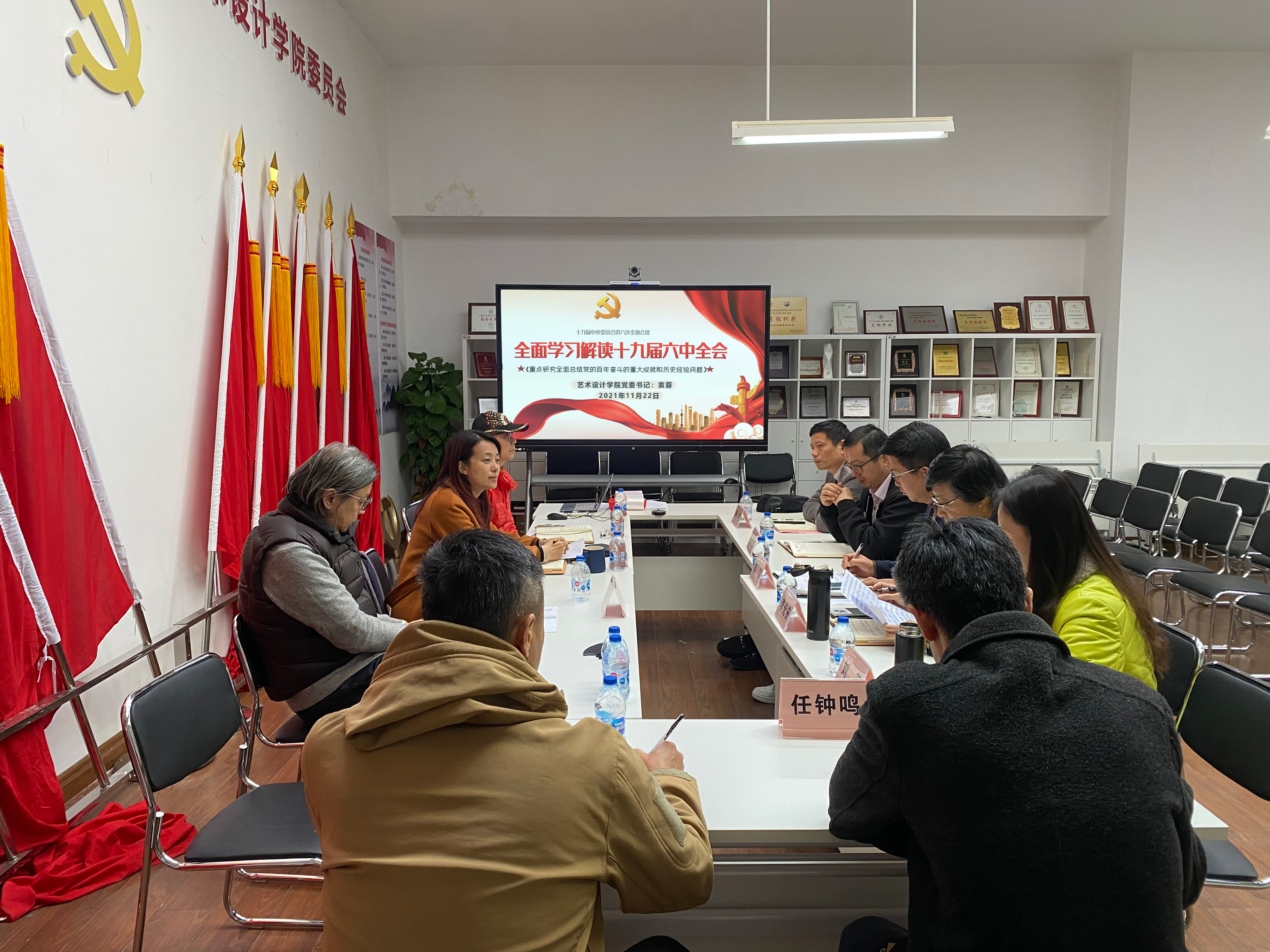 11月22日,艺术设计学院党委中心组在艺术楼A412会议室召开学习贯彻党的十九届六中全会精神专题学习研讨会,重点围绕学习《中共中央关于党的百年奋斗重大成就和历史经验的决议》和习近平总书记关于《决议》的说明交流学习体会。艺术设计学院党委书记袁蓉主持学习会。全体中心组成员出席会议。校党史学习教育巡回指导第二组刘洋老师列席会议。