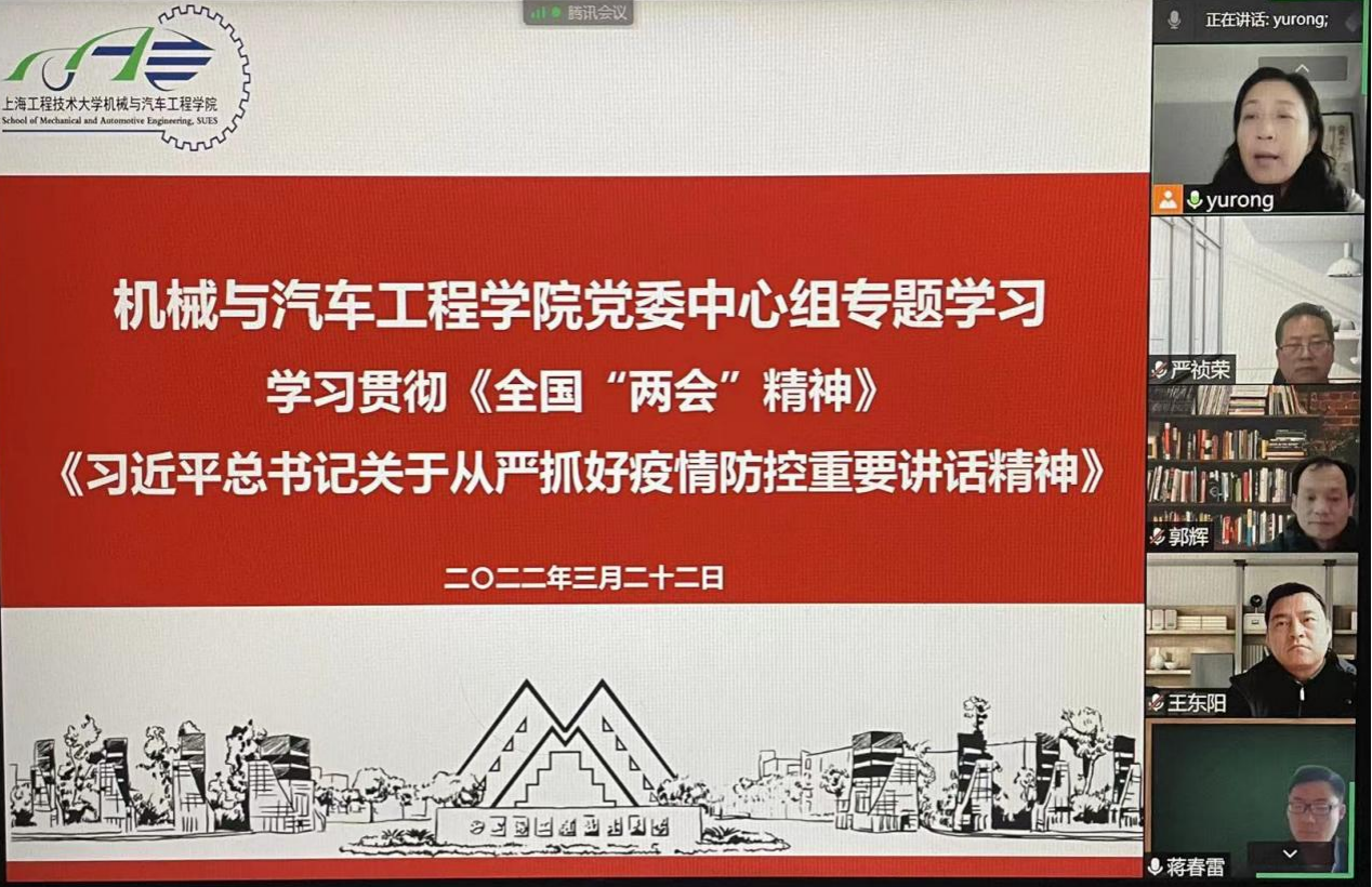 为坚决贯彻习近平总书记重要讲话精神和学习全国两会精神,3月22日下午,机械与汽车工程学院党委召开线上中心组专题学习会,学院党委成员、党政班子成员等参加了专题会议。会议由学院党委书记虞蓉主持。
