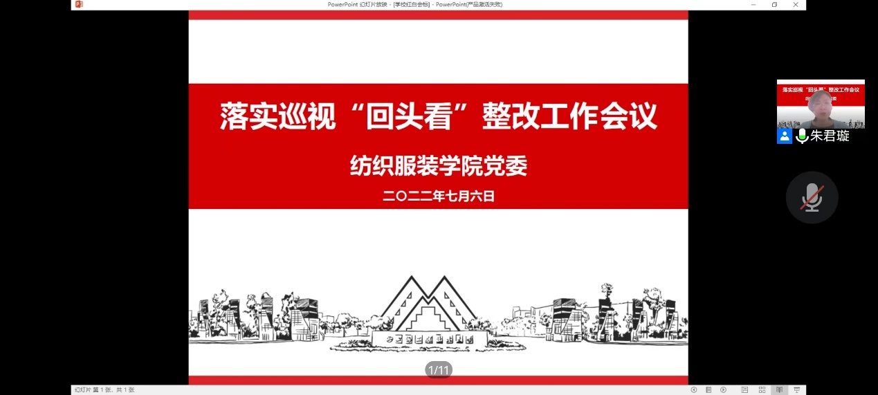 近日,纺织服装学院党委采取线上线下相结合的的方式召开巡视“回头看”整改工作会。学院全体党政班子成员、党支部书记、系室主任及全体教职员工参会。会议由院党委书记朱君璇主持。
