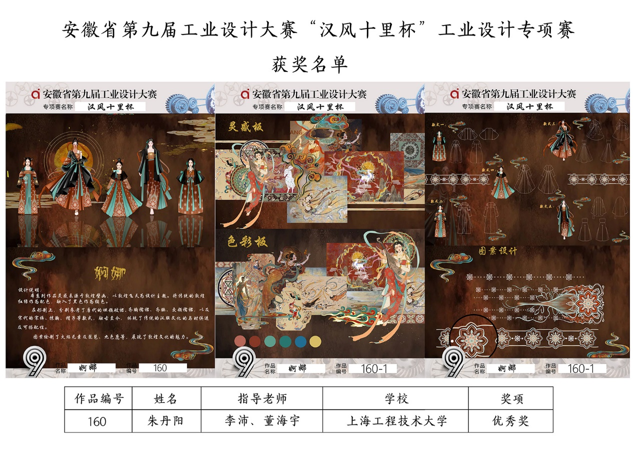 “汉风十里杯”工业设计专项赛以中国历代汉服传统形制为主,以中国传统纹样图案为主体进行设计创新并符合现代审美为宗旨,秉承实用性原则,兼顾市场推进价值,进行亲子装汉服及汉服配饰设计。朱丹阳同学以敦煌壁画为灵感,以敦煌飞天为设计主题,将传统的敦煌元素与汉服文化相融合,展现了传统文化的魅力。最终,朱丹阳同学的参赛作品《婀娜》从本次参赛的344幅作品中脱颖而出,获得优秀奖的好成绩。