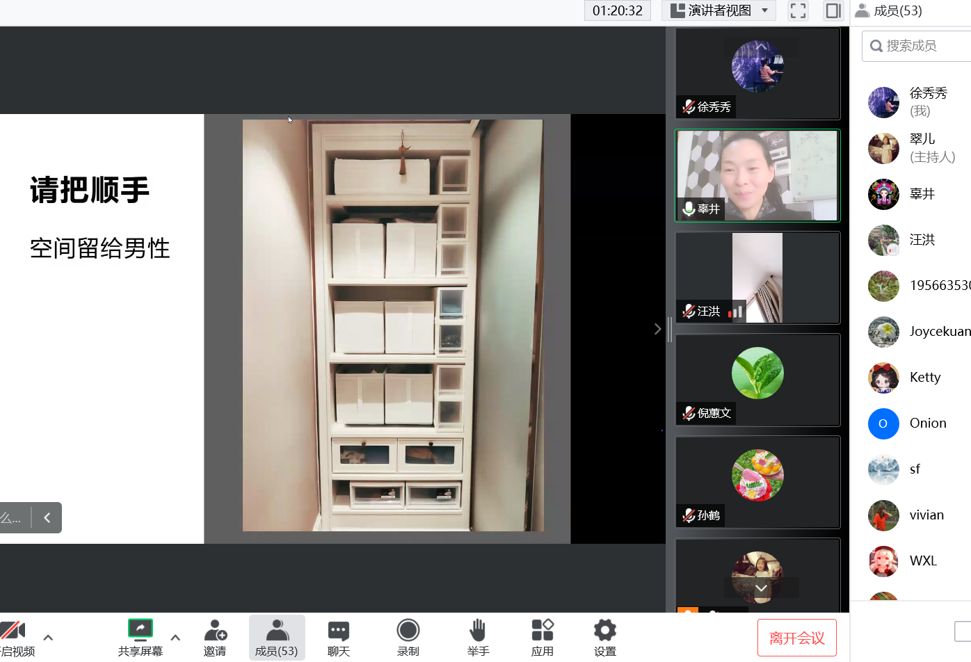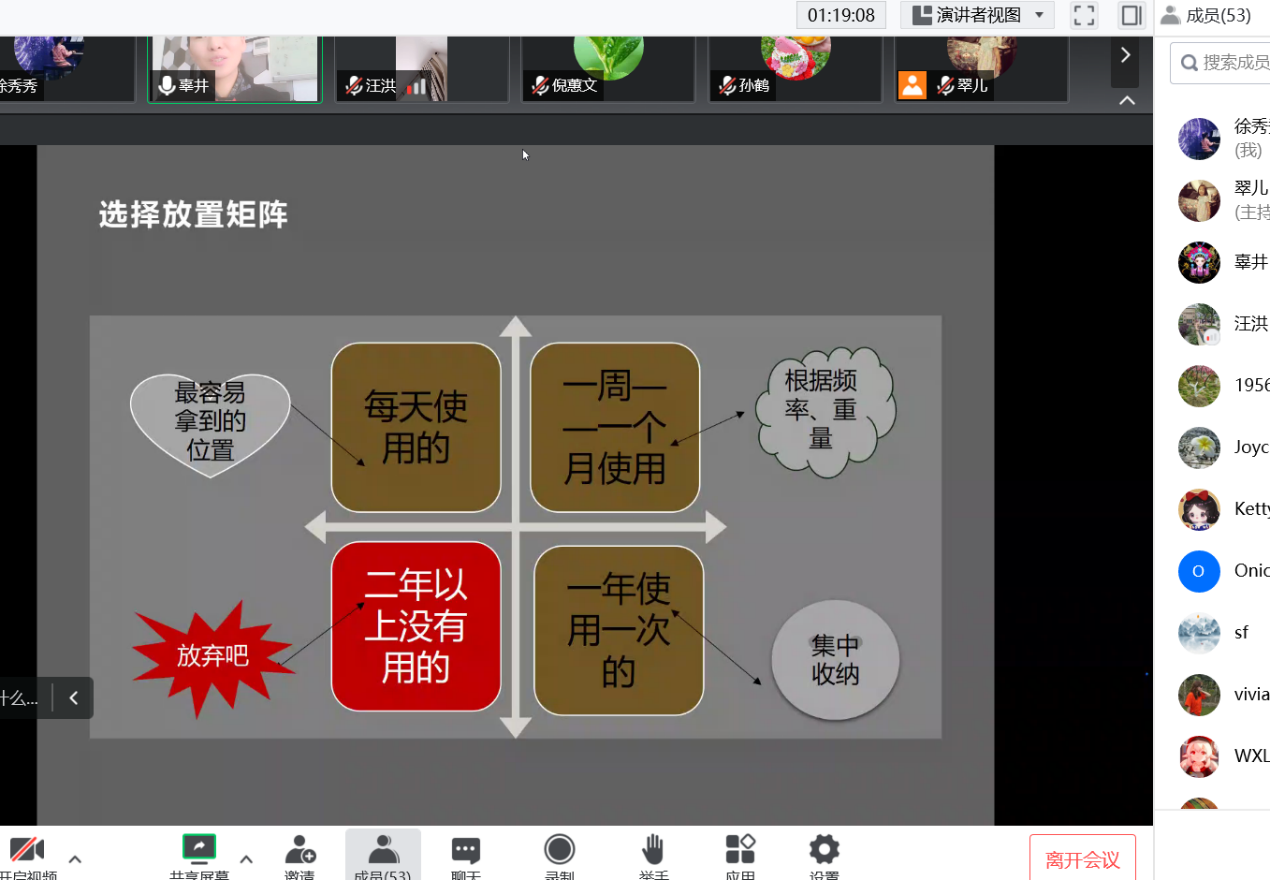 11月15日下午,图书信息档案联合工会通过线上腾讯会议开展了“这么收,‘纳’么美”主题活动。本次活动邀请了上海市普陀纳样美收纳研究院理事长、职业整理收纳师辜井老师主讲,活动由徐秀秀老师主持,五十多位教职工参加了活动。