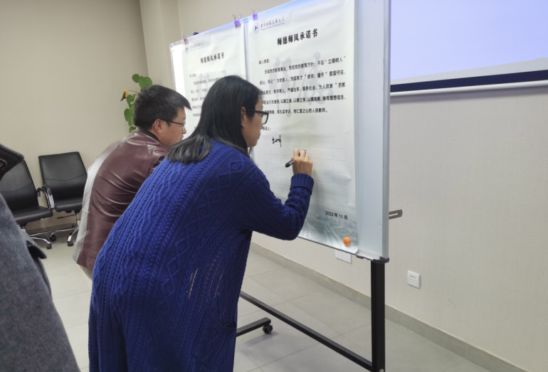 学院组织员部署近期党建工作要点,各党支部交流学习宣传贯彻党的二十大精神推进情况。会后大家纷纷签署了师德师风承诺书。