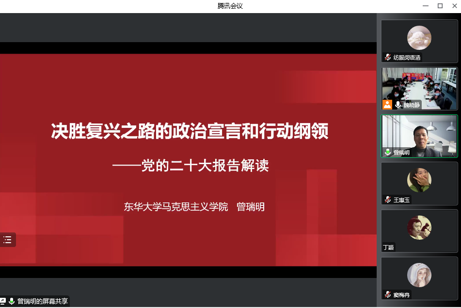为贯彻落实《中共中央关于认真学习宣传贯彻党的二十大精神的决定》,切实引导广大党员师生学习宣传贯彻党的二十大精神,12月1日,纺织服装学院党委邀请东华大学马克思主义学院教授、上海市形势政策教育研究会副会长曾瑞明以“决胜复兴之路的政治宣言与行动纲领——党的二十大报告解读”为主题为学院党员师生作专题辅导报告。学院党政领导班子、党支部书记、系室主任、部分师生党员以及党章学习小组长以线上线下相结合的方式共同参加学习。报告会由学院党委书记朱君璇主持。