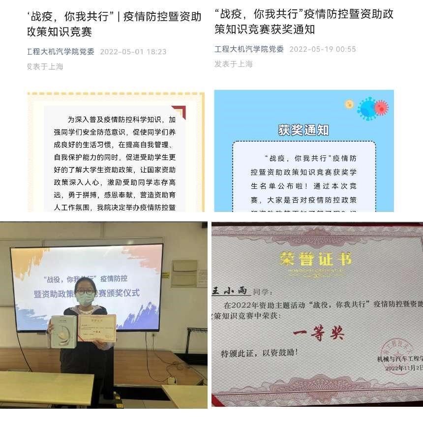 疫情期间,学院将资助政策宣传与疫情防控宣传并重并举,以育人为着力点开展《“战疫、你我共行”疫情防控暨资助政策知识竞赛》,在推动贯彻疫情防控政策的同时,让防疫知识与国家资助政策深入人心,以赛促学,以学促行。学院为获奖学生颁发证书及奖品,激励受助学生积极向上,在国家及学校的大力资助下,从自我解困逐步迈向成长成才。