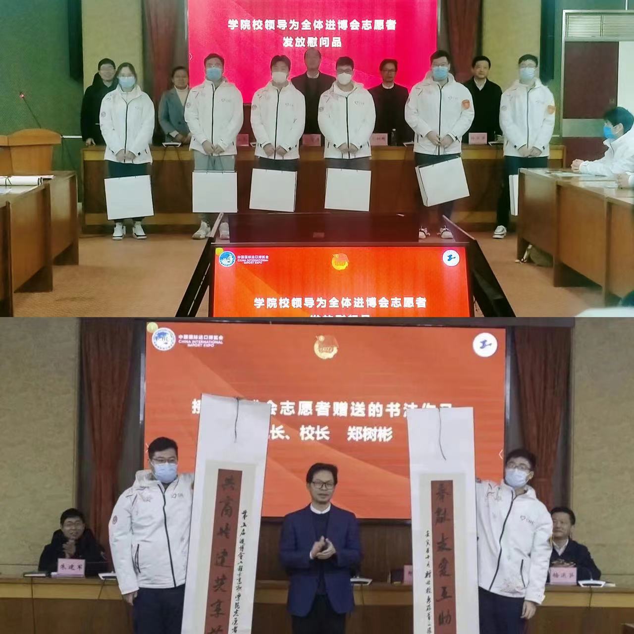 在会上,学院校领导为小叶子们发放慰问品,同学们拿到暖心礼物脸上洋溢着喜悦之情。小叶子们还准备了书法作品赠送给学校,上联“共享共建共商共赢”代表着进博会的召开与我国对外开放的决心;下联“奉献友爱互助进步”代表了同学们服务进博的精神传承,整幅书法也表达了同学们对学院的感激之情,高职学院院长、高级技校校长郑树彬代表学院接收了这份珍贵的礼物。青春心向党,奋斗正当时!作为当代青年大学生,只有经风雨、见世面才能长知识、增才干,高职学院“小叶子”们也将继续秉承“奉献、友爱、互助、进步”的志愿精神,将接力棒传给下一届同学!