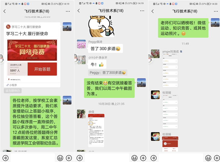 各工会小组依托所在系室、教工支部,借助学习强国、腾讯会议等线上平台,围绕党史知识、新党章、二十大报告等开展了学习和竞答活动,有些小组还通过打榜晒榜方式持续地推动互促互学。