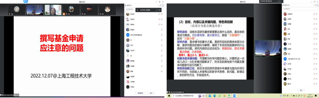 为了进一步提高学院教师国家自然科学基金项目申报书的撰写质量,提升申报的成功率,帮助学院教师积极准备2023年度国家自然科学基金申报。12月7日,数理与统计学院邀请中国科学院紫金山天文台刘庆忠教授线上作题为“撰写基金申请应注意的问题”的专题辅导报告。报告会由数理外国语联合党委书记钱慧敏教授主持,学院以及兄弟学院100余名教师参加了此次辅导讲座。