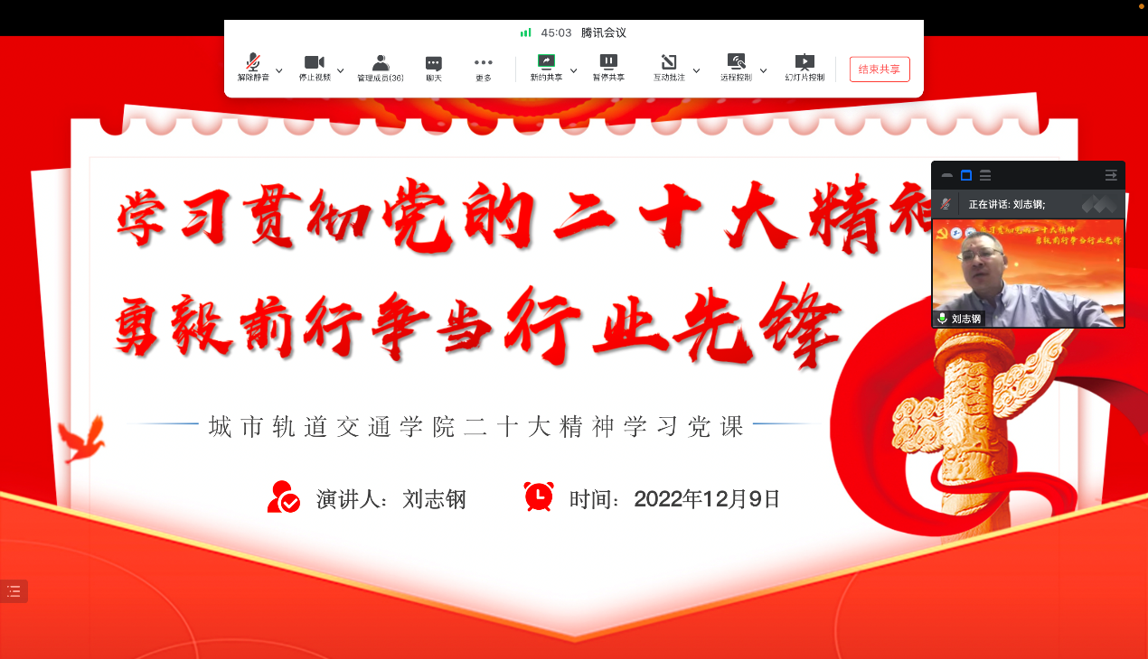学习贯彻二十大,踔厉奋发新征程。城市轨道交通学院运营管理学生党支部邀请城市轨道交通学院党委副书记、院长刘志钢老师,于12月9日在线上召开主题为《学习贯彻党的二十大精神,勇毅前行争当行业先锋》专题党课。运营管理学生党支部全体学生党员、入党积极分子参加学习。活动由运营管理学生党支部书记张佳丽主持。