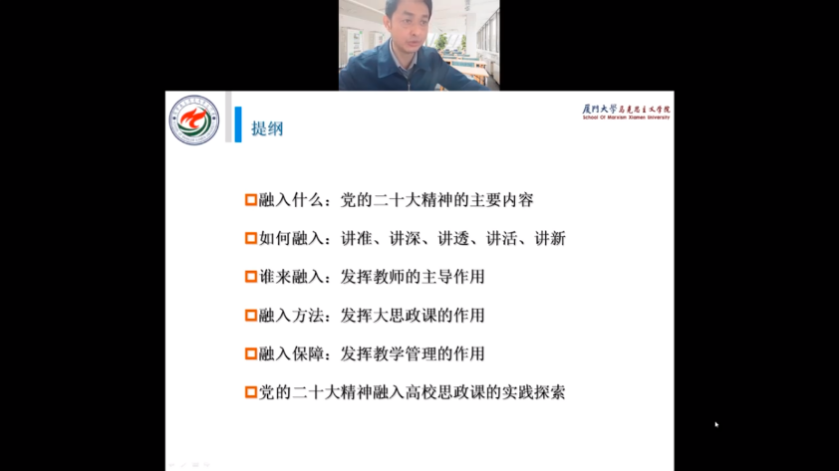 此次培训,主办方邀请中央党校杨秋宝教授、北京师范大学邢国忠教授,厦门大学张有奎教授和中国人民大学路克利研究员等四位专家围绕党的二十大精神的丰富内涵与精神实质,融入课堂的主要内容与方式方法、有效途径等方面进行了系列报告。专题培训内容丰富,为学院教师探索将党的二十大精神有机融入课程思政开拓了视野,明确了目标和方向,提供了有效途径和方法。