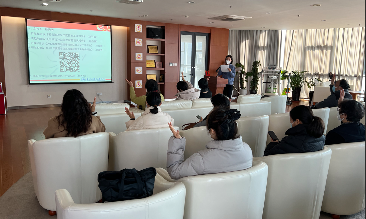 会议在庄严的国歌声中正式开幕。会上,教职工审阅了《图书馆2022年行政工作报告》《图书馆2022年财务报告》《2022年度图书信息档案联合工会工作报告》和《2022年度图书信息档案联合工会财务报告》。
