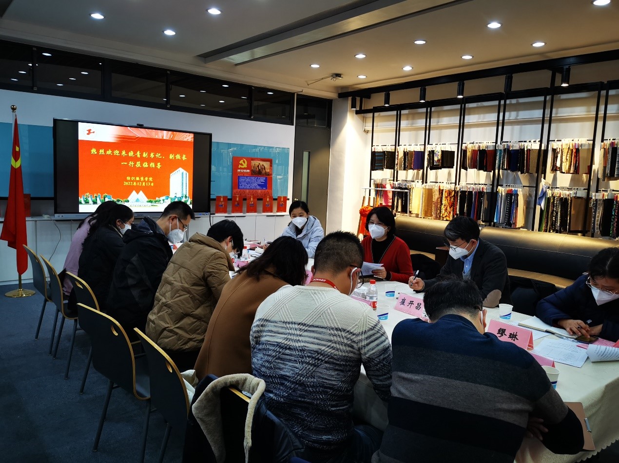 12月13日,校党委副书记、副校长朱晓青带队赴纺织服装学院开展学院工作大调研,调研主题为“贯彻落实党的二十大精神,推动纺织服装学院发展”。校党委办公室副主任、党委政策研究室主任崔开昌,校党委学生工作部副部长、学生处副处长、党委研究生工作部副部长缪琳,校党委组织员王瑞芳以及纺织服装学院党政领导班子、全体就业辅导员参加了调研会,会议由学院党委书记朱君璇主持。