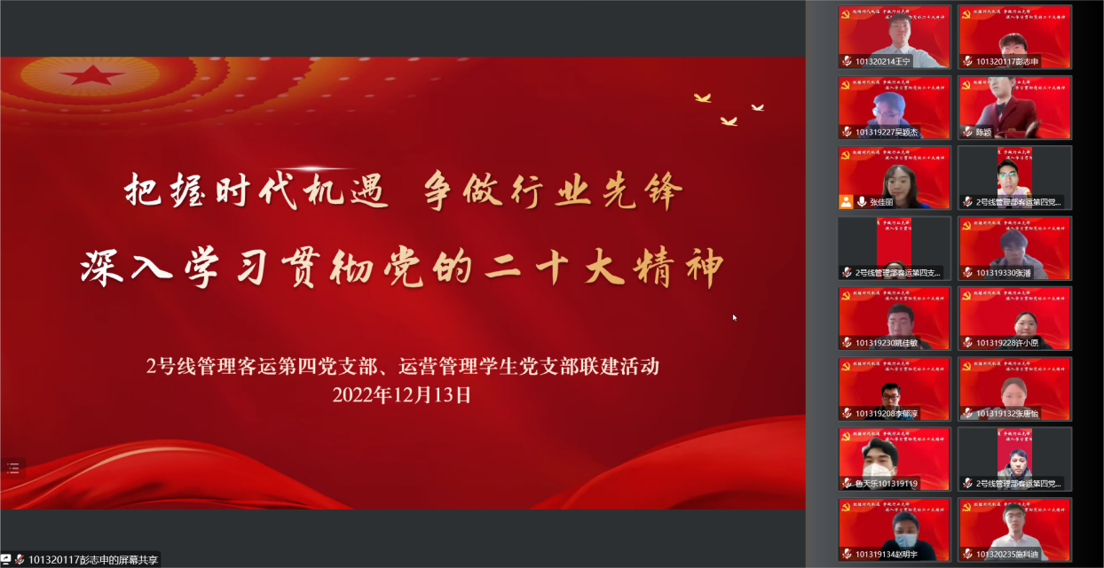 为推动党的二十大精神学深学实,以联建促党建,以共学促交流,城市轨道交通学院运营管理学生党支部联合上海地铁2号线管理部客运第四党支部,于12月13日在线上组织开展“把握时代机遇 争做行业先锋——深入学习贯彻党的二十大精神”联建共学活动。上海地铁2号线管理部客运第四党支部书记陈颖、运营管理学生党支部书记张佳丽、2号线管理部客运第四党支部党员及发展对象、运营管理学生党支部全体党员及入党积极分子参加此次活动。运营管理学生党支部书记张佳丽主持活动。