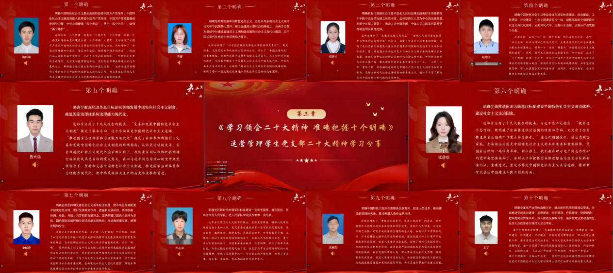 支部十位党员同志对比“八个明确”和“十个明确”的内容改变,对习近平新时代中国特色社会主义思想主体部分的“十个明确”录制了有声书,通过以原声诵原文,感受习近平新时代中国特色社会主义思想在理论层面上的新突破、新发展,让党的二十大精神绕于耳边,植于心田。