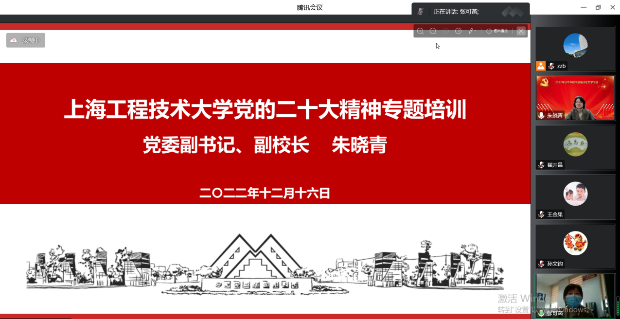 为学习贯彻党的二十大精神,12月16日下午,学校2022年中层干部党的二十大精神培训班举行专题学习。校党委副书记、副校长朱晓青以“学习贯彻党的二十大精神,加快推进大学文化建设”为题讲授专题党课。全体中层干部线上参加学习。党委组织部副部长、党校常务副校长张可菡主持学习。