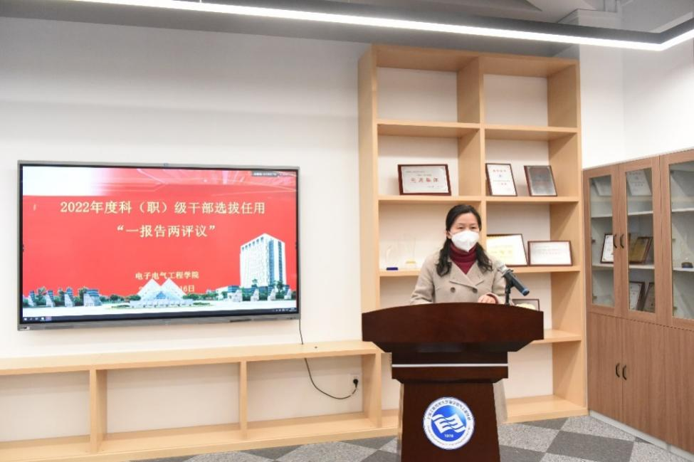 会上,范君晖书记就本次“一报告两评议”工作的要求、内容及测评办法等方面作了详细介绍。,并做了《关于电子电气工程学院2022年度科(职)级干部选拔任用工作情况的报告》的专题报告,报告从学院“选拔任用科(职)级干部的总体情况”“贯彻党的干部路线方针政策的情况”“创新选人用人措施和办法,建立健全干部选拔任用和监督机制的情况”“干部选拔任用机制存在的主要问题及改进措施”等四个方面详细阐述了学院在科(职)级干部选人用人上的思路、不足及改进措施。