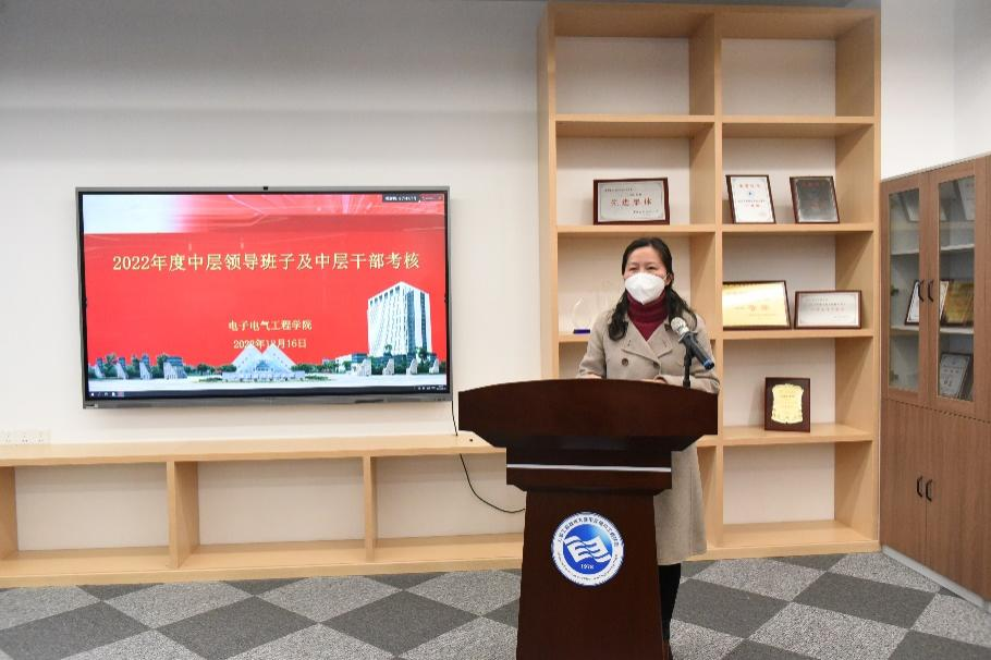 会上,电子电气工程学院党委副书记、院长李媛媛代表学院领导班子作了2022年度学院中层领导班子工作报告,报告主要围绕深入推进全面从严治党、学科建设、研究生培养、专业建设、科研活动、国际化交流、人才培养等方面,全面回顾了学院在党的二十大胜利召开之年,在全面提升教育质量和内涵水平建设上各项工作的推进情况及取得的成绩。