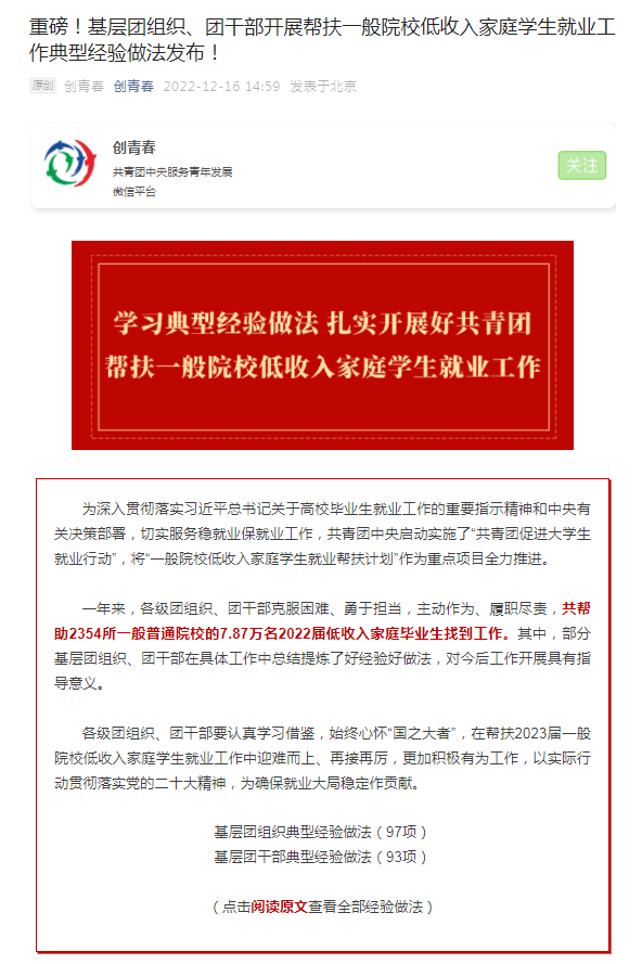 据悉,为深入贯彻落实习近平总书记关于高校毕业生就业工作的重要指示精神和中央有关决策部署,切实服务稳就业保就业工作,共青团中央启动实施了“共青团促进大学生就业行动”,将“一般院校低收入家庭学生就业帮扶计划”作为重点项目全力推进。自“共青团促进大学生就业行动”开展以来,校团委不折不扣落实团中央、团市委要求,高度重视低收入家庭学生就业问题,主动对接学校就业办等相关部门,助力“六稳”“六保”工作。校团委整合资源,摸清就业意向、提供就业指导、推荐岗位信息、关注就业进展、持续跟踪辅导,力所能及为结对学生提供“就业帮扶礼包”,用心用情用力帮助青年学生就业。团委注重拓渠道,以政企挂职锻炼、“挑战杯”“三下乡”“知行杯”等为牵引,引导程园青年主动就业创业;以“第二课堂成绩单”为抓手,不断提升青年学生就业创业竞争力。