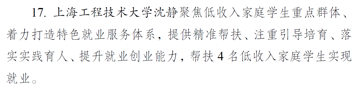 近日,团中央公布基层团组织、团干部开展帮扶一般院校低收入家庭学生就业工作典型经验做法。团委沈静老师帮扶一般院校低收入家庭学生就业工作的做法入选基层团干部典型做法(全国共93项),这也是上海市唯一入选的公办高校做法。