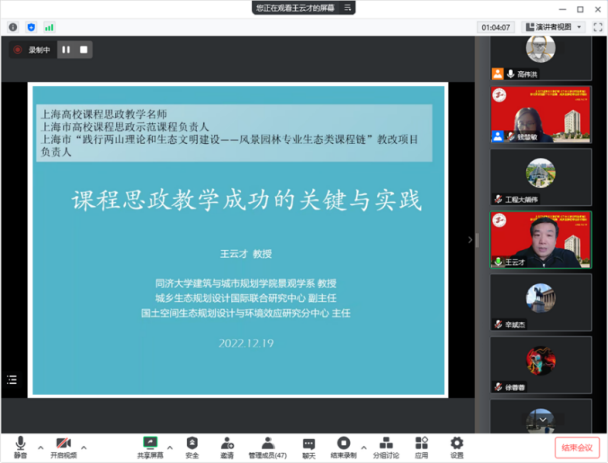 王云才教授结合自身工作经验提出“三位一体课程思政教学”,从主体环境、教学理念和教学抓手三个方面诠释了什么是课程思政以及如何做好课程思政,并通过具体生动的教学案例,总结归纳了课程思政教学成功的关键因素。王教授特别强调课程思政的关键是教师,倡导教师用做科研的精神来开展课程思政的教学研究,这样才能真正做好课程思政。