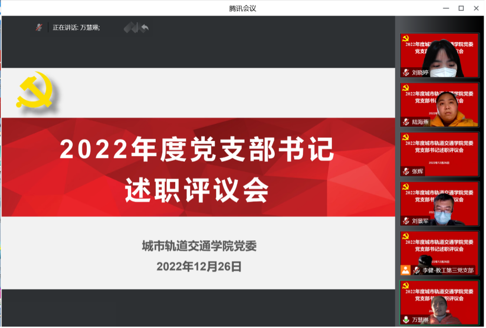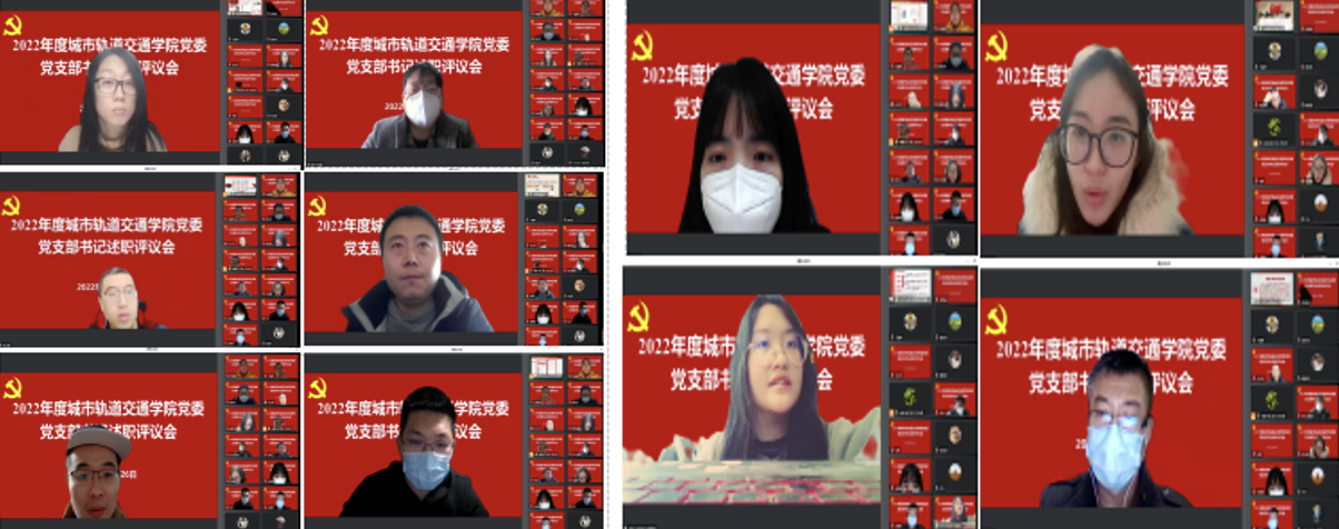为深入学习贯彻党的二十大精神,认真落实学校党委相关部署要求,进一步推动党支部书记切实履行抓基层党建工作责任,提升支部书记队伍建设质量。12月26日下午,城市轨道交通学院党委在线召开2022年度党支部书记述职评议会,学院党委书记万慧琳,党委副书记盛知恒,党委委员、工会主席李健,全体党支部书记,党支部委员及部分党员代表参加会议。会议由学院党委组织员陆海燕主持。