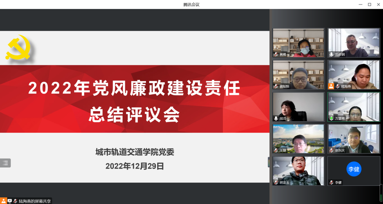 为进一步推进学院党风廉政建设,强化廉政风险防控,深化“四责协同”,推动全面从严治党走深走实。12月29日下午,城市轨道交通学院党委召开2022年党风廉政建设责任总结评议会。会议特邀校纪委委员、管理学院党委书记周洁出席会议,学院全体党政领导班子成员等参加会议。会议由学院党委书记万慧琳主持。